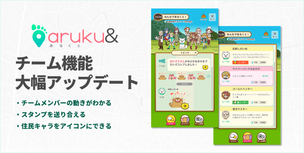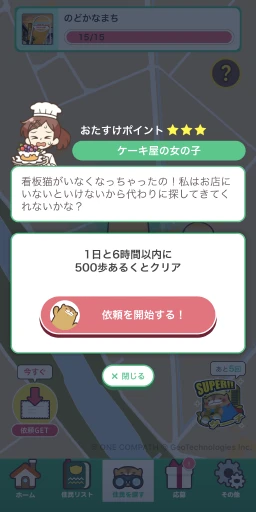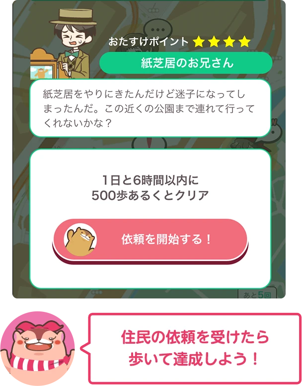 ウォーキングは単調になりがちですが、「aruku&」はゲーム要素を取り入れることで楽しみながら歩く習慣を促進します。マップ上には多彩な「住民キャラクター」が登場し、彼らからの依頼をクリアすることでゲームが進行します。キャラクターとの交流を楽しみながら、自然に健康を意識できます。