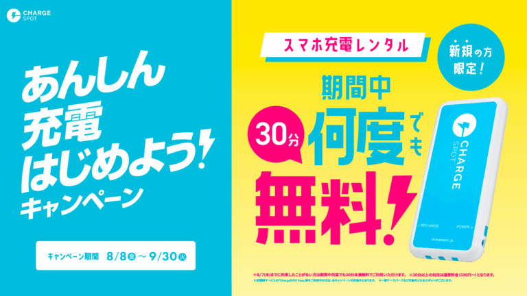 2025年8月8日(金)〜9月30日(火)まで、「あんしん充電はじめよう!キャンペーン」が開催されます。全国の「ChargeSPOT」が新規ユーザー限定で30分間無料で利用できます!駅やコンビニ、観光地などで気軽にお試しください。