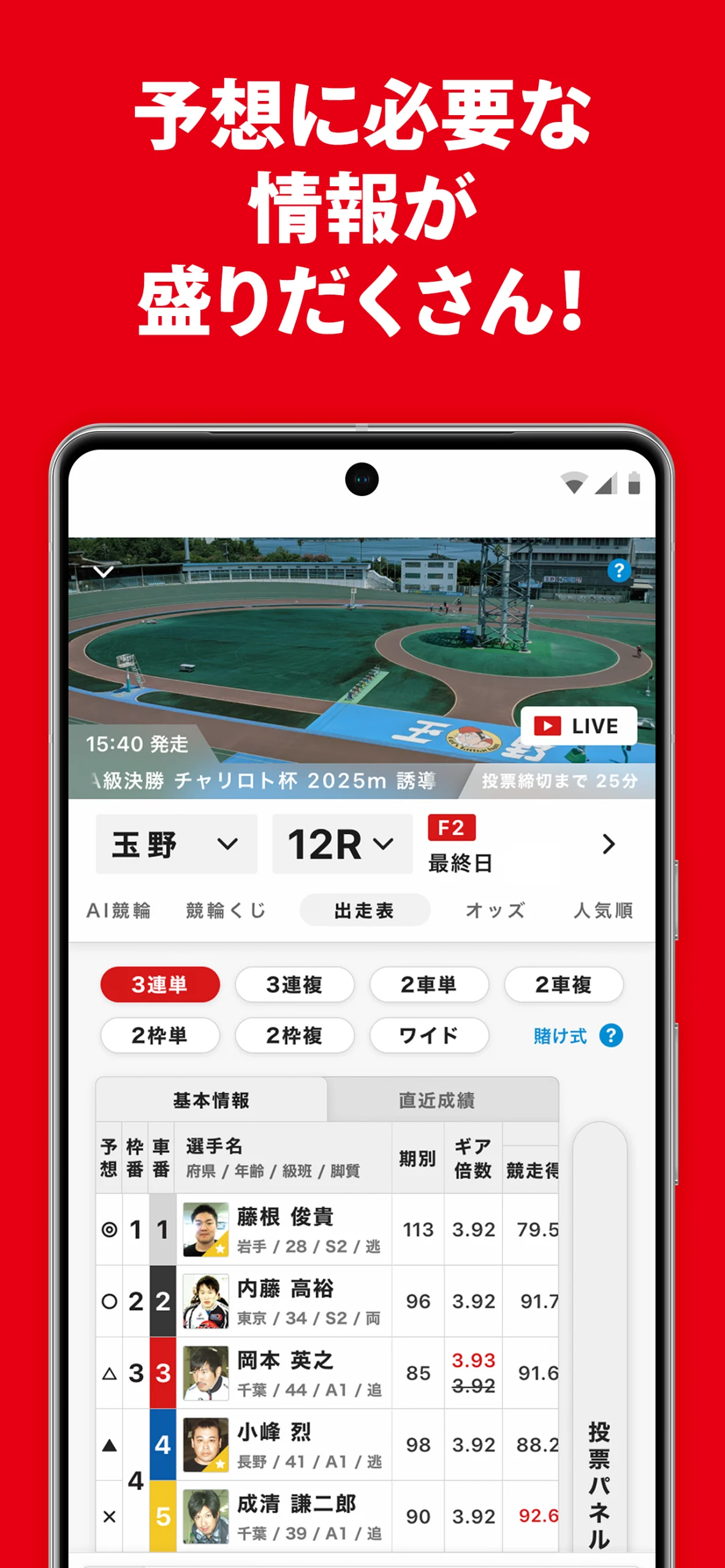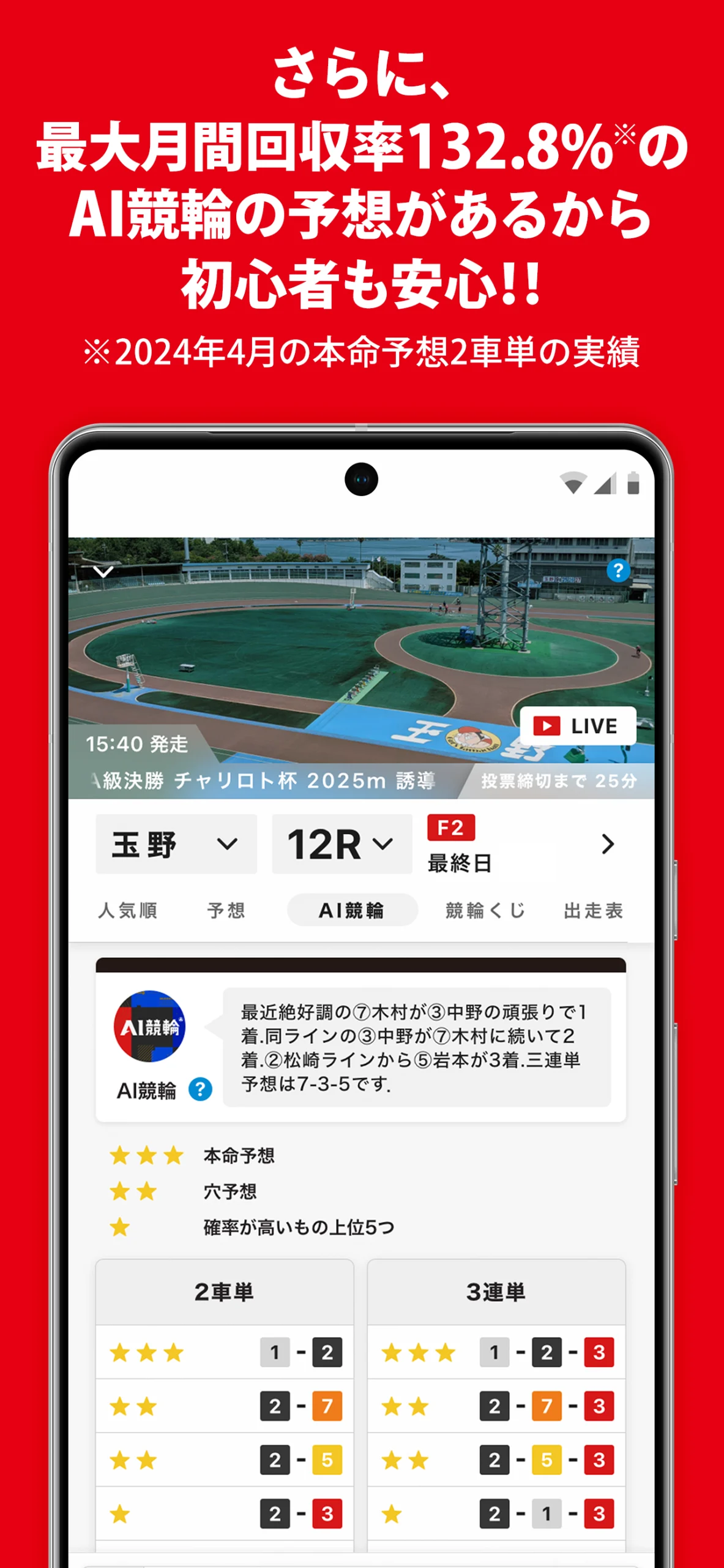 チャリロトでは、出走表、過去成績、オッズ、予想紙といった基本情報はもちろん、専門家の予想やAI分析も利用可能。さらに、レースのライブ配信も楽しめるので、まるで会場にいるかのような臨場感を味わえます。