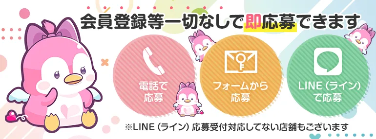 「店舗での面接に応募する勇気がありませんでした。しかしながら、はじめての風俗アルバイトでは、LINEで簡単に応募できるので、ハードルが低くて、興味のある店舗に迅速に応募できます。応募後、店舗への入店時に3,000円のQUOカードがもらえて、嬉しい特典でした。」