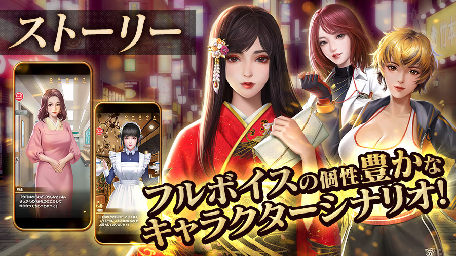 PC(ブラウザ)とAndroidデバイスでプレイ可能です。プレイヤーは、歌舞伎町地区で美しい女性たちと絆を深め、彼女たちを仲間として仲間に加え、ビジネスを経営し、お金を稼ぎ、最終的に頂点を目指す内容となっています。