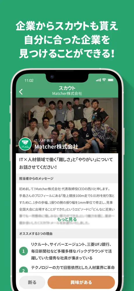 最後に、企業からスカウトオファーを受けたい人にも、こちらのサービスをおすすめします。MatcherはOB訪問だけでなく、企業からのスカウトオファーを受け取ることもでき、新しい企業を発見する機会を提供しています。