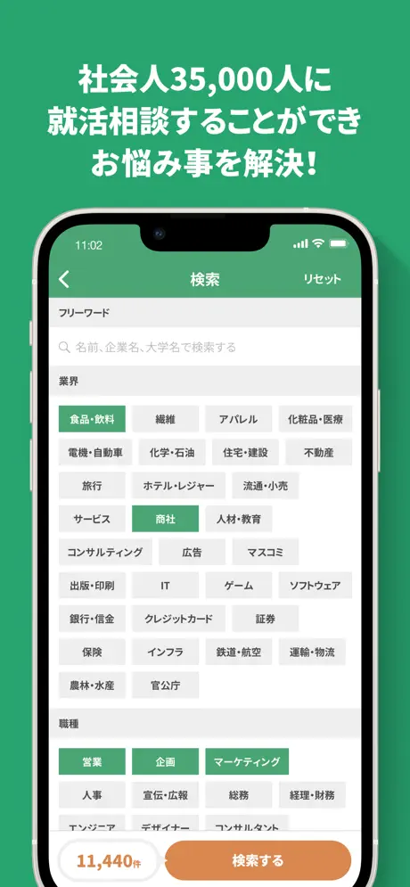 Matcherの最大の特徴は、大学の枠を超えた、多様な分野で活躍する42,000人の社会人と出会える点です。興味のある業界や、キャリアに関する実際の体験談を聞くことができます。さらに、企業から直接の採用オファーを受け取ったり、自分に合った企業を効率的に検索したりすることも可能です。