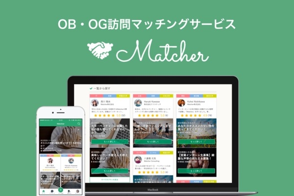 Matcherは日本で最大のOB/OG訪問アプリです。35,000人以上の社会人が登録されており、約100万件のマッチングが成立しています。