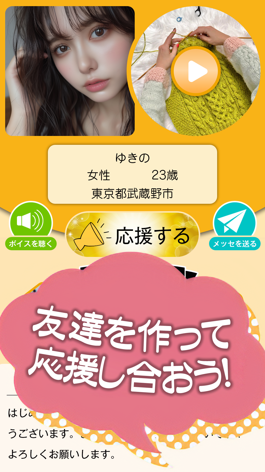 ユニークな仕組みとして「応援機能」があり、相手にメッセージや気持ちを伝えられるため、コミュニケーションが温かく広がります。小さなアクションから親密な関係に発展しやすいのも特徴です。