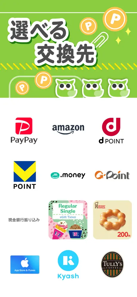 - 貯まったポイントは、現金や商品券などと交換できる。